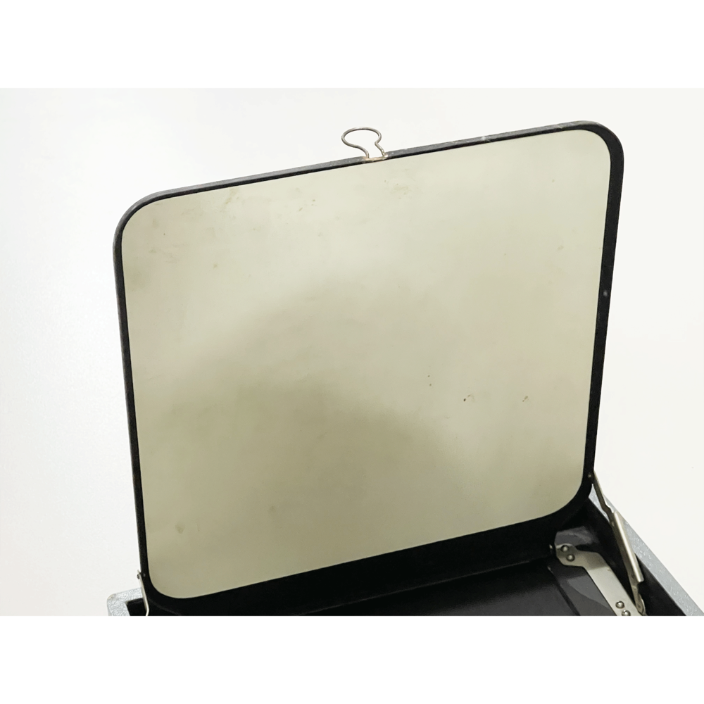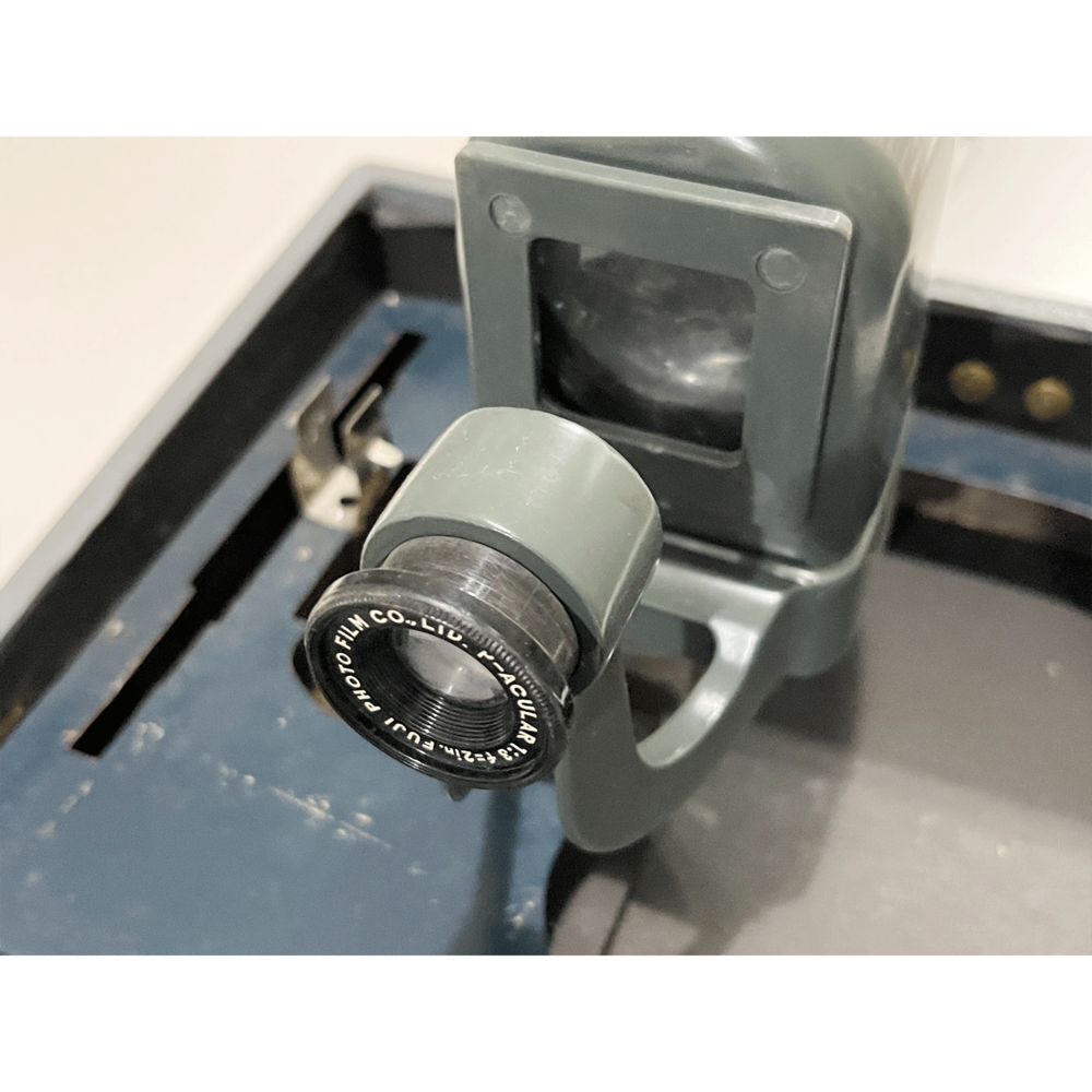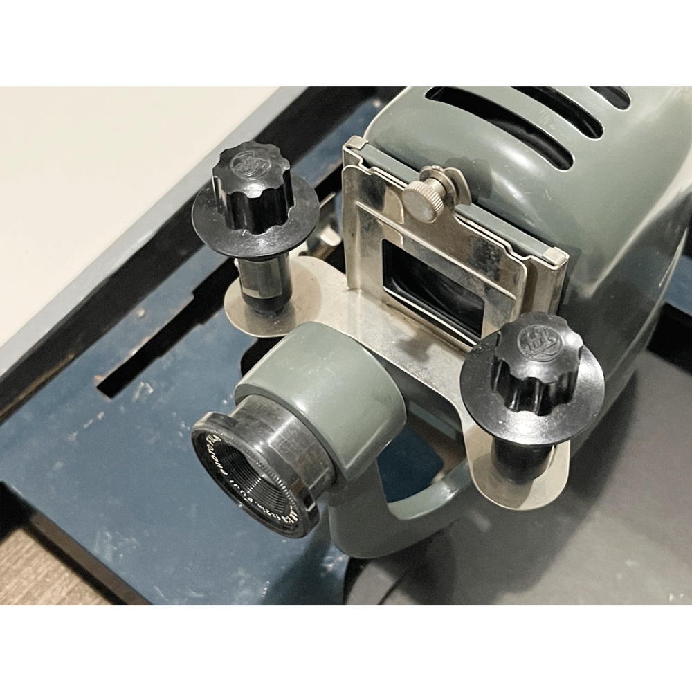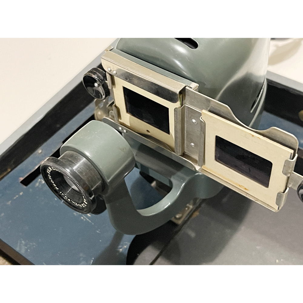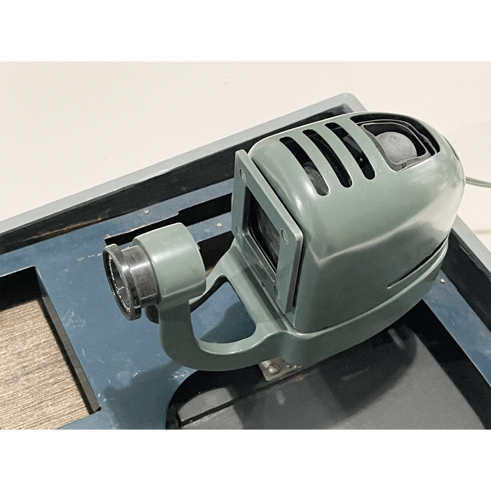 소형 스크린 내장된 슬라이드 프로젝터입니다. 케이스를 열고 수납된 본체를 일으켜, 케이스의 반대에 수납된 스크린을 일으켜 사용합니다. 110v. 정상작동됩니다.