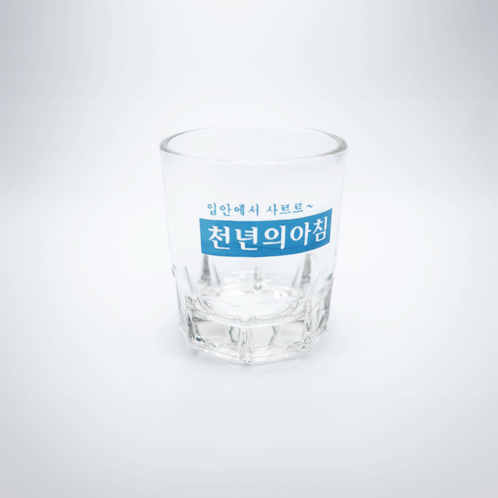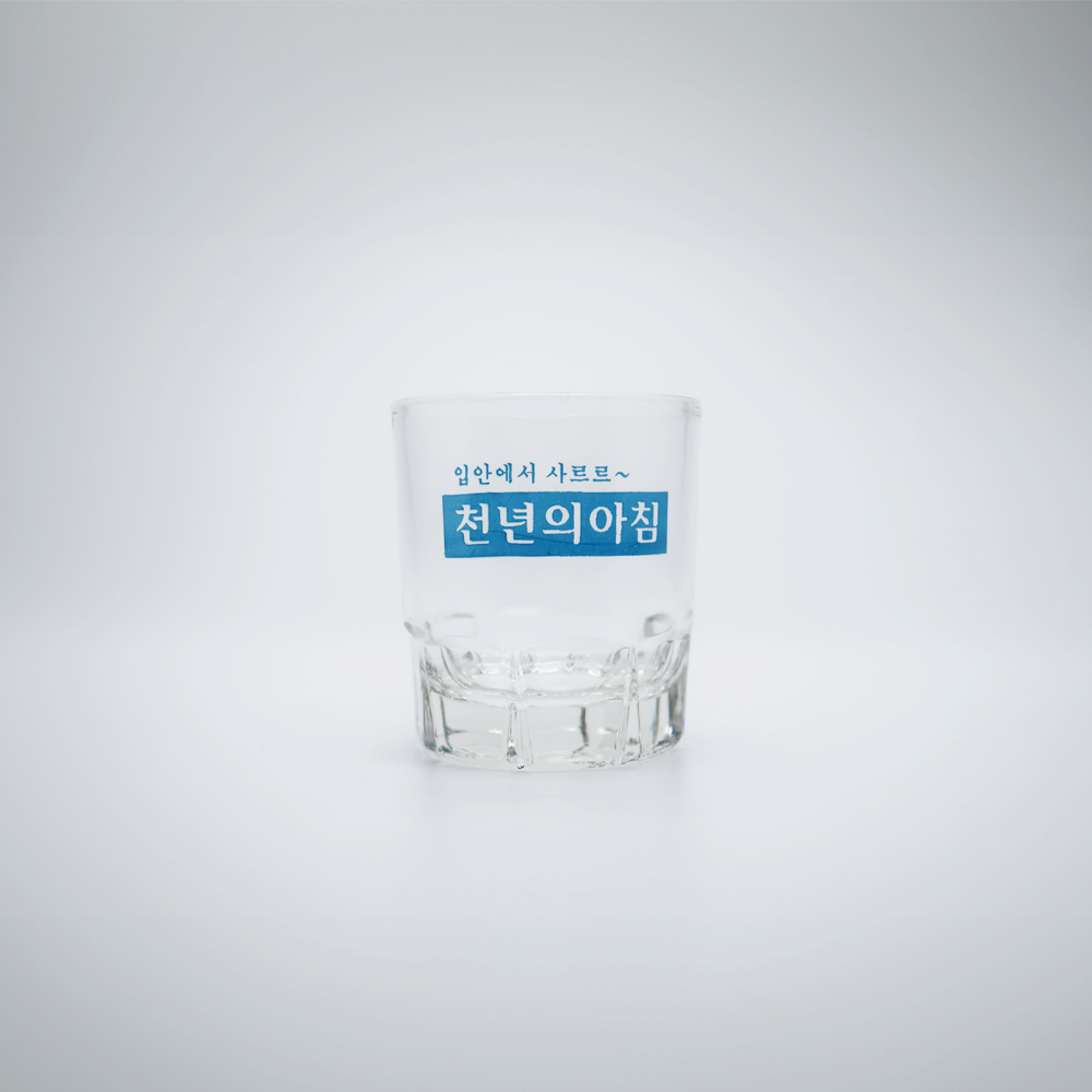 보해양조에서 출시한 전남 장성 공장 주변에서 나오는 심층 암반수를 황토옹기로 여과해 맛이 깨끗한 소주 '천년의 아침' 소주잔입니다. 보해양조는 1950년 설립되었으며 보해(寶海)라는 이름은 창업주 임광행 씨가 자란 곳이자 본사 소재지인 목포의 앞바다, 그리고 한반도를 둘러싼 3면의 바다를 모두 은유하는 단어입니다.